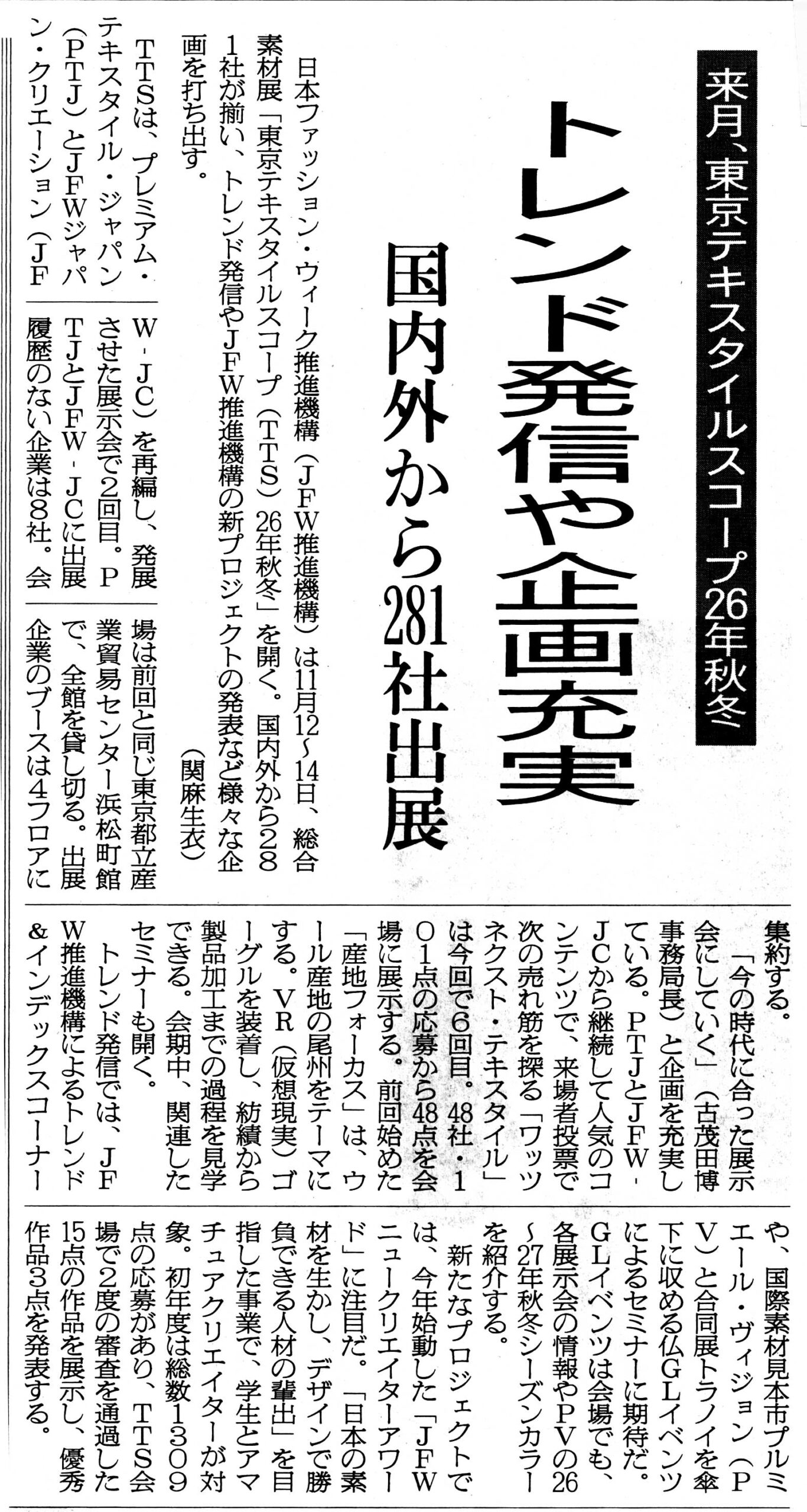 2025年10月22日の繊研新聞にて、「東京テキスタイルスコープ 2026 Autumn/Winter」の開催概要が紹介されました。