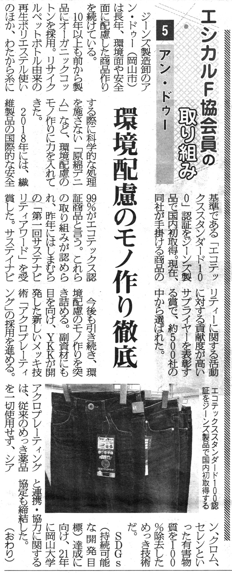 【メディア掲載】繊維ニュース/アンドゥー|環境配慮のモノ作りを徹底 ― エコテックス認証ジーンズを展開
