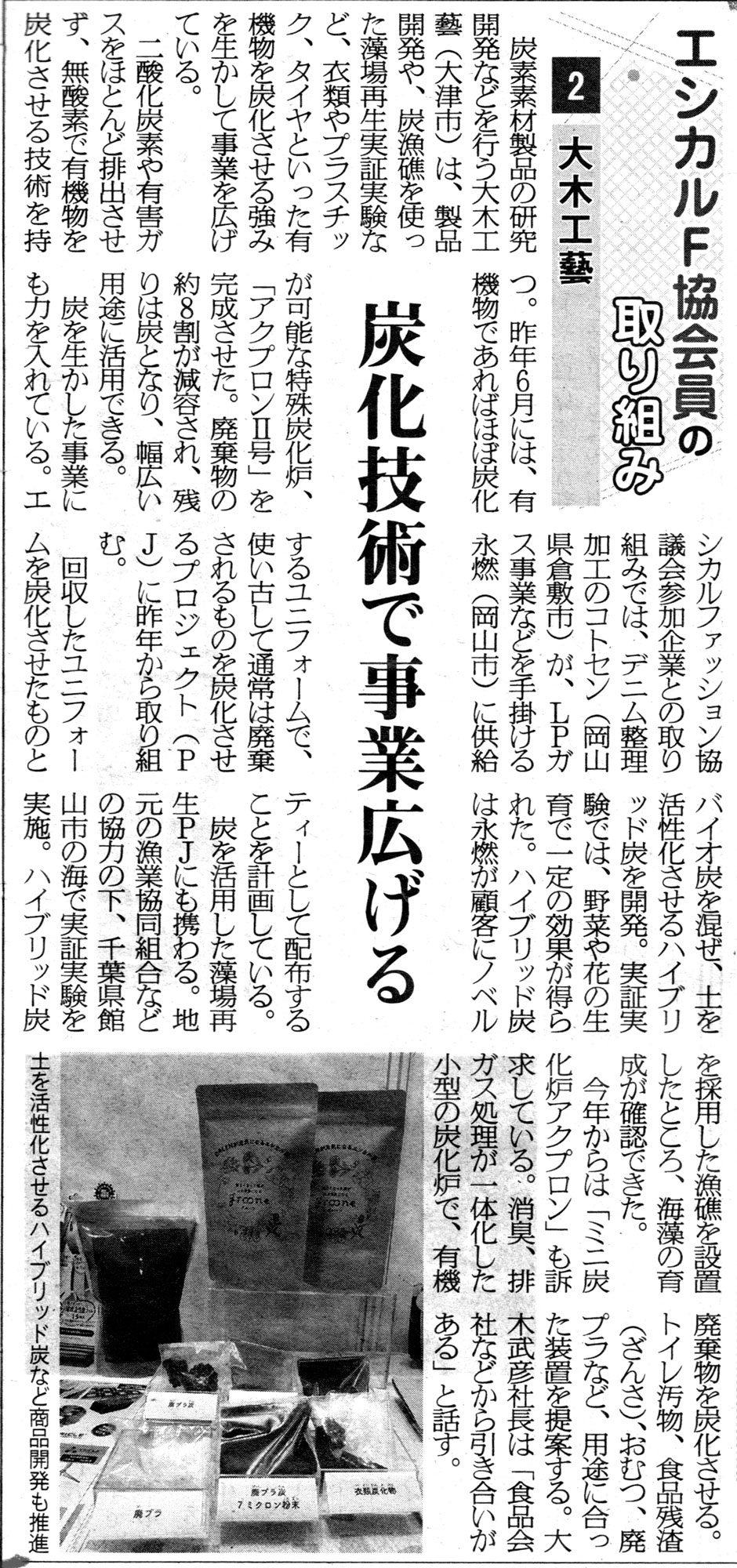 【メディア掲載】繊維ニュース/大木工藝|炭化技術で事業広げる