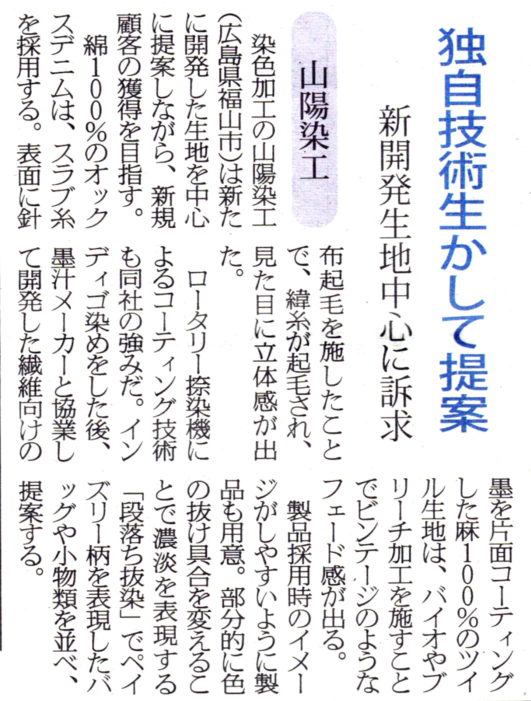 【メディア掲載】繊維ニュース/山陽染工|独自技術を活かした新開発生地を提案