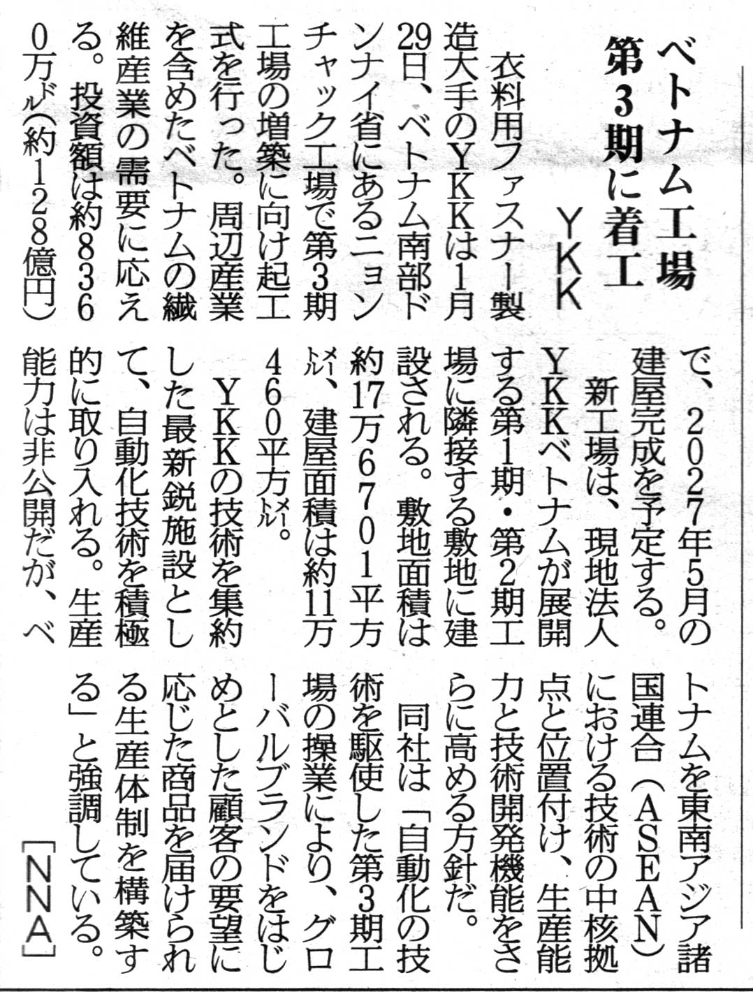 2月6日付の 繊維ニュース に、YKKのベトナム工場着工の記事が掲載されました。