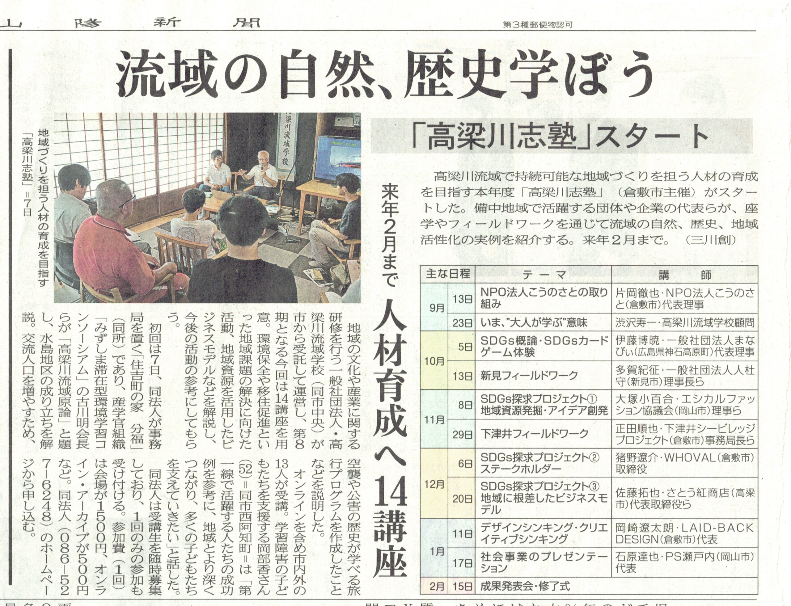2025年9月7日の山陽新聞に、高梁川流域で持続可能な地域づくりを担う人材育成を目的とした「高梁川志塾」の記事が掲載されました。