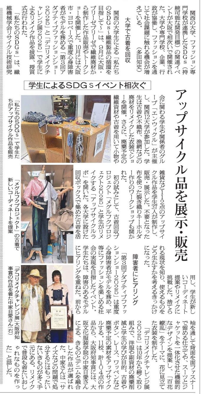2025年11月19日の繊研新聞に、関西の大学や専門学校が連携して開催したSDGs関連イベントが紹介されました。