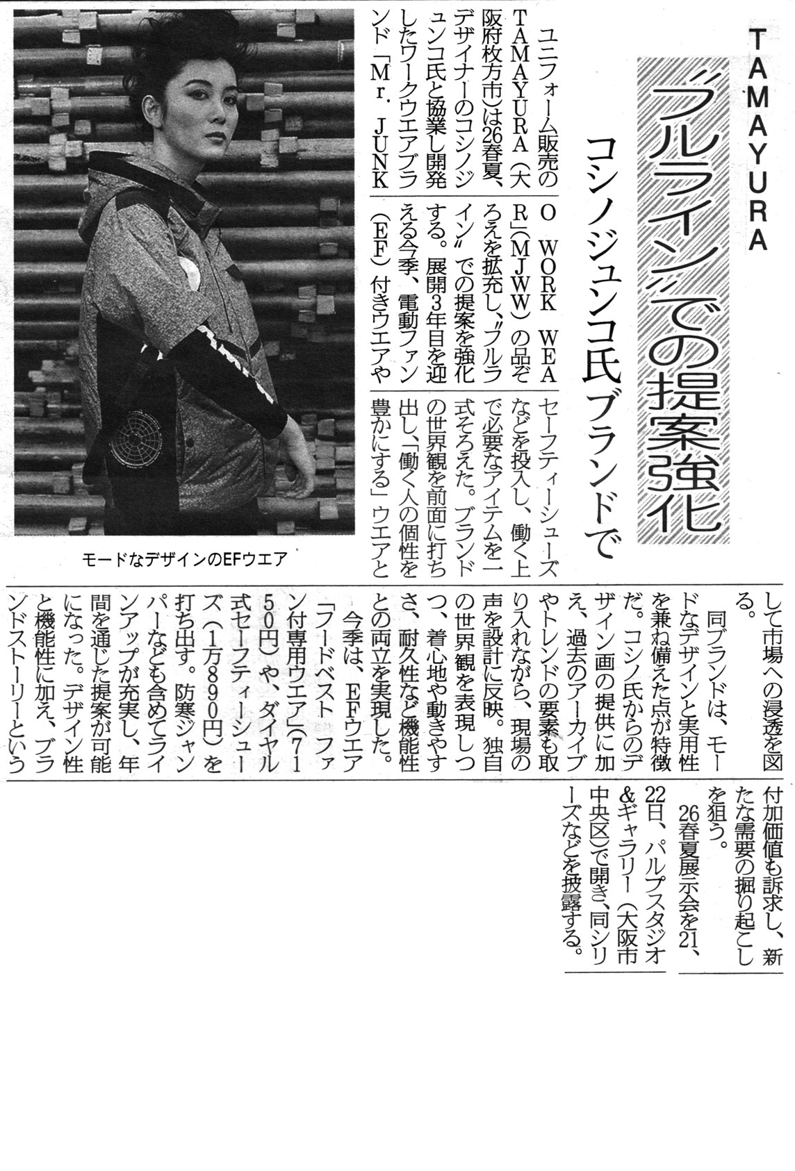 1月9日付の繊維ニュース で、TAMAYURAのモードなデザインの電動ファン付きウエアなどが紹介されました。