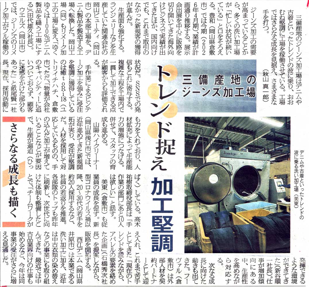 【メディア掲載】繊維ニュース/三備産地のジーンズ加工場