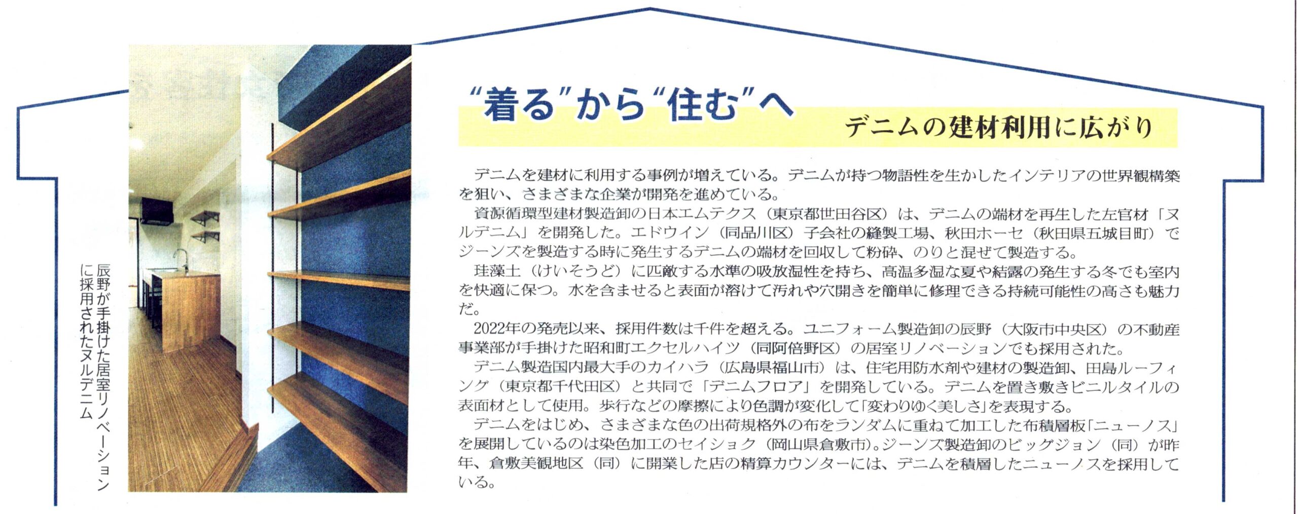 3月27日付の 繊維ニュース に、デニムの建材利用の事例についての記事が掲載されました。